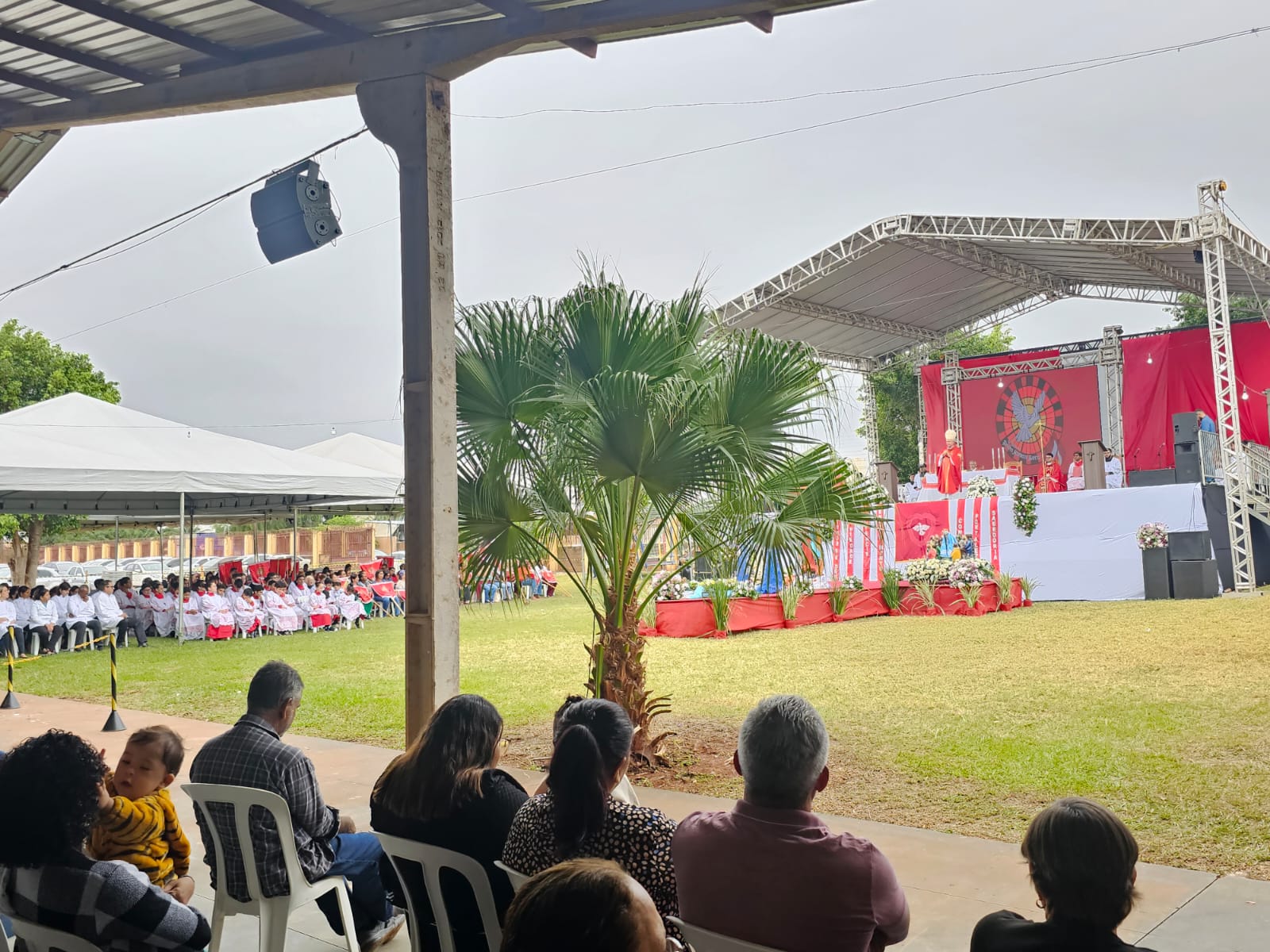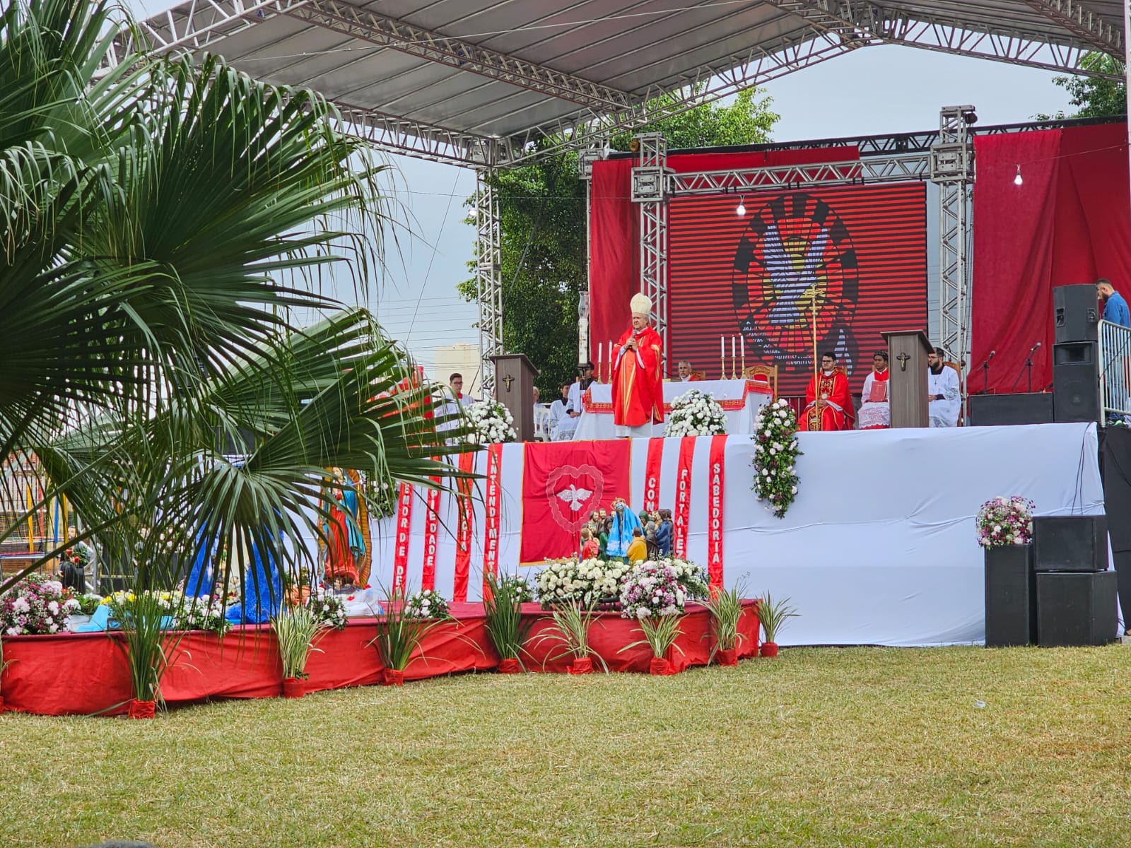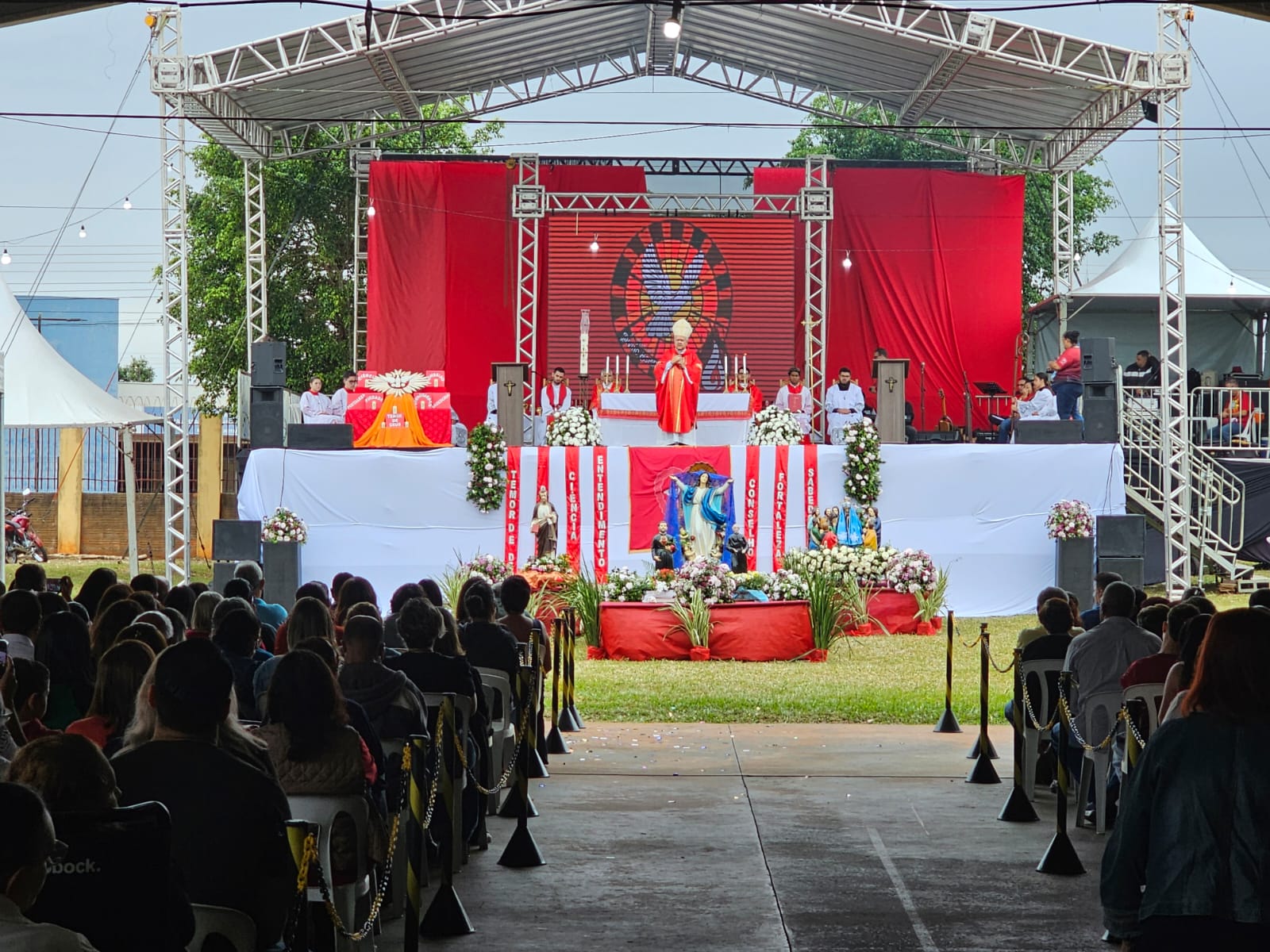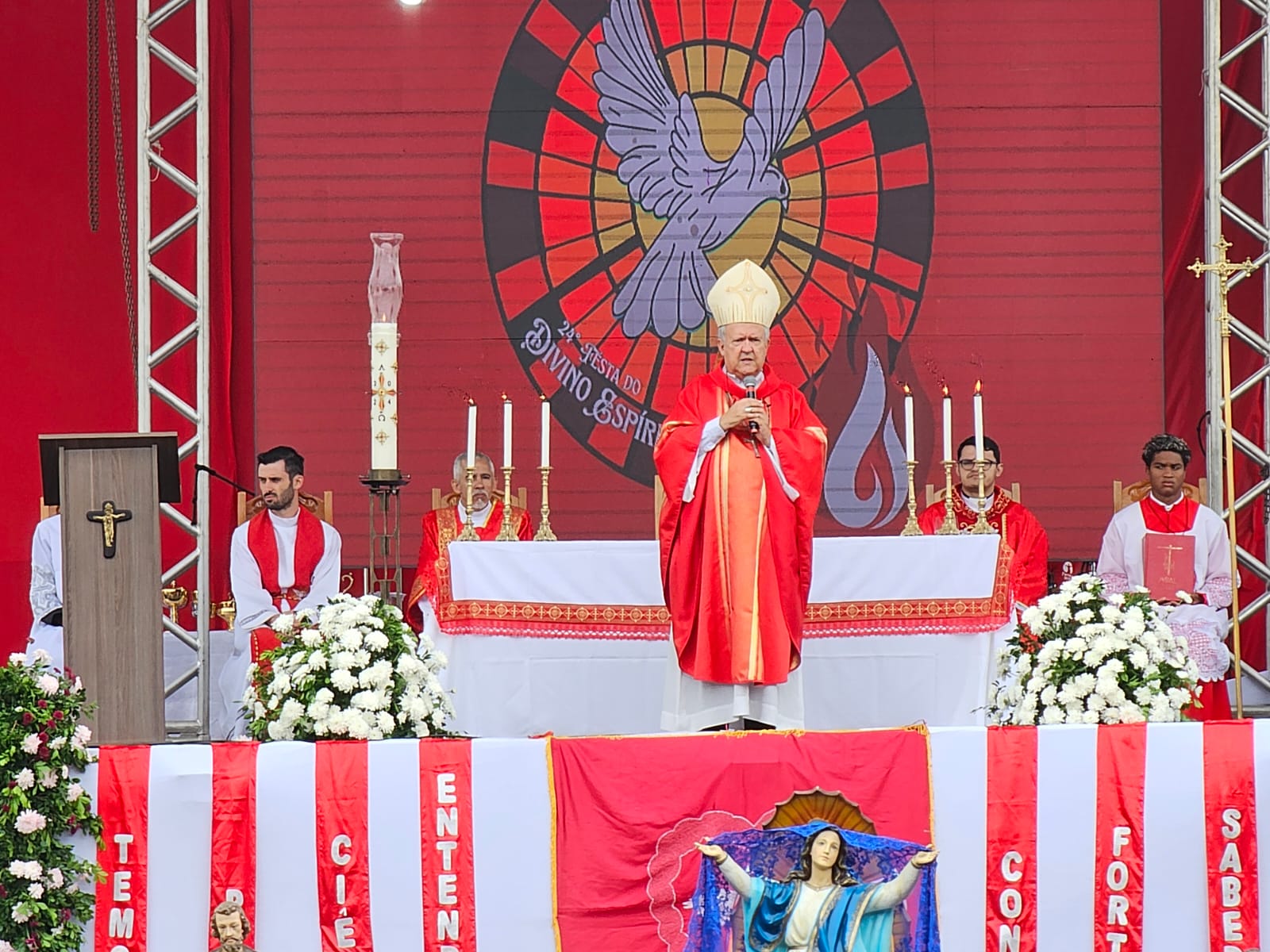 E tudo começou bem cedo. Vários integrantes das sete comunidades já estavam na Matriz para os preparativos da festa. A partir das 08h00, as comunidades começaram chegar em procissões trazendo as imagens de seus padroeiros. Às 09h00, iniciou a Santa Missa, que foi presidida pelo Arcebispo de Campo Grande, Dom Dimas Lara Barbosa, juntamente com o Pe. Rodrigo Fernandes Menegatti, Pe. Douglas Giuliani Durigon e Diác. Itamandaré José Santana. Além de todo o rito da celebração eucarística, a presença das missionárias com bandeiras do Divino foi um momento marcante. Uma tradição própria dos devotos do Divino Espírito Santo.