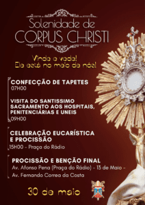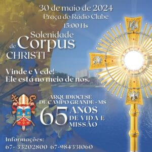 Na quinta-feira, 30 de maio, quando os cristãos católicos em todo o mundo fazem memória do Santíssimo Sacramento do Corpo e do Sangue de Cristo, a maior festa da Eucaristia, fieis das comunidades de fé da Arquidiocese de Campo Grande estarão em unidade participando da Santa Missa às 15h00, na Praça do Rádio.