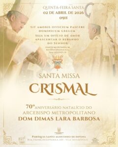 Já às vésperas da Semana Santa deste ano, Dom Dimas Lara Barbosa convida todos os fieis para participar da celebração da Santa Missa Crismal ou Missa dos Santos Óleos, que será celebrada no dia 02 de abril, às 09h, na Paróquia Santo Agostinho de Hipona.